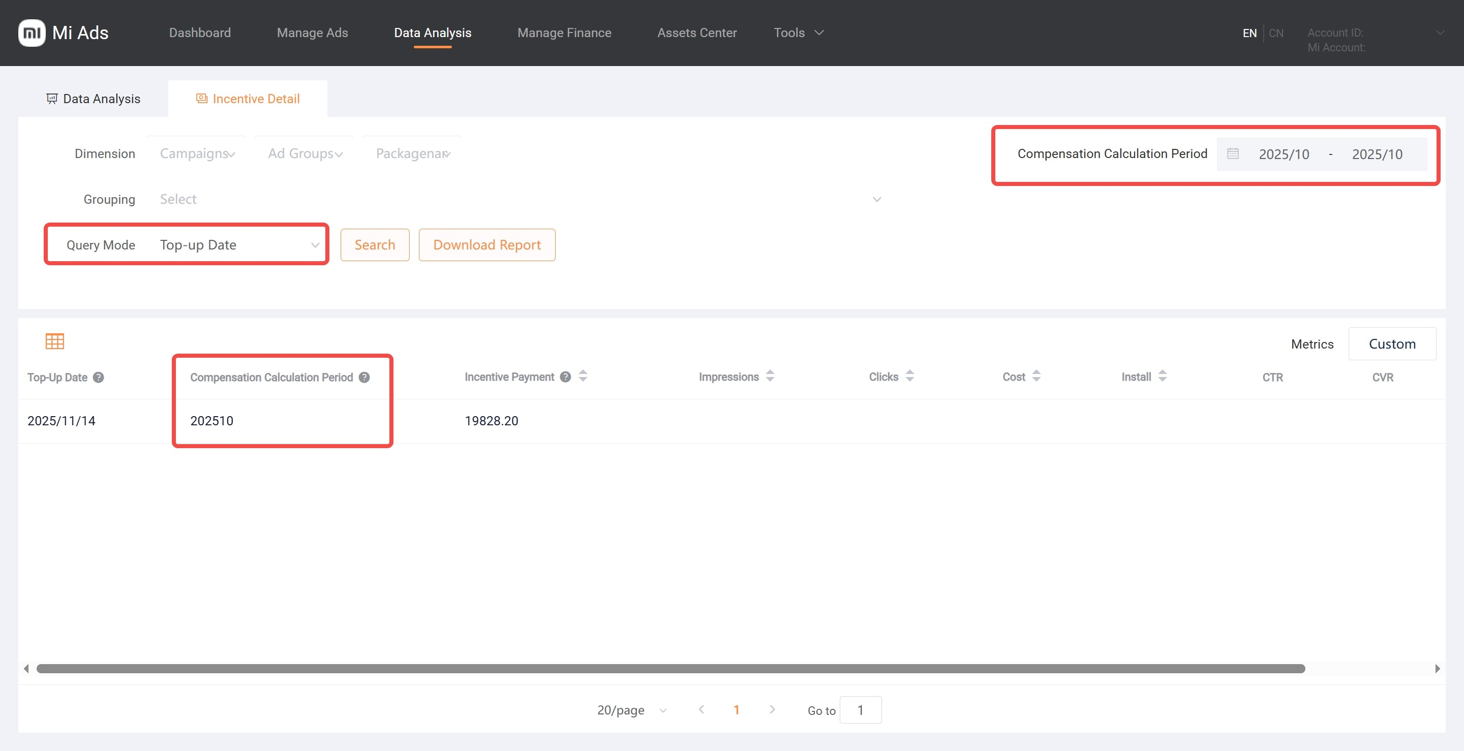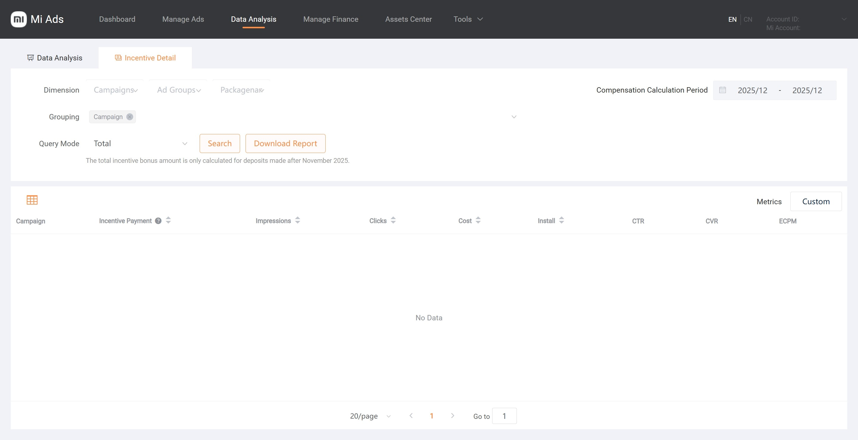 In the Data Analysis module, under Incentive Details, you can view incentives, costs, and performance metrics (impressions, clicks, conversions, CTR, CVR, and eCPM) by ad group.You can view the actual incentives from the previous month after the 10th of each month, and the estimated incentives for the current month from the 1st to the 10th of the following month.