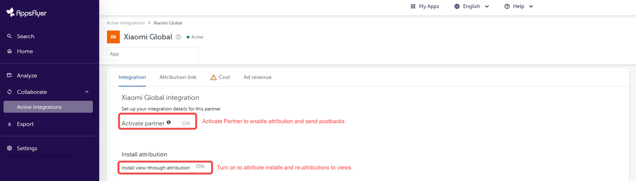 - Toggle the Activate Partner switch to ON to begin sending postback data to Xiaomi Global. Make sure the Install view-through attribution switch is also turned ON. Then click Save at the bottom right corner.