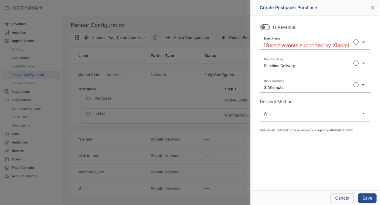 - For "Postback destination", you need to select "Xiaomi Global" and then choose "EVENT"