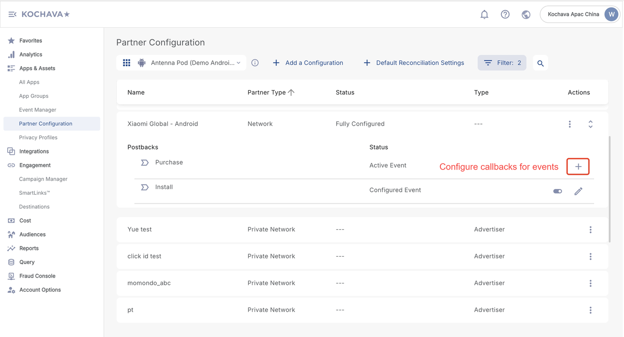 After entering the Kochava page, find "Partner Configuration" in the left sidebar and click "+ Add a Configuration".