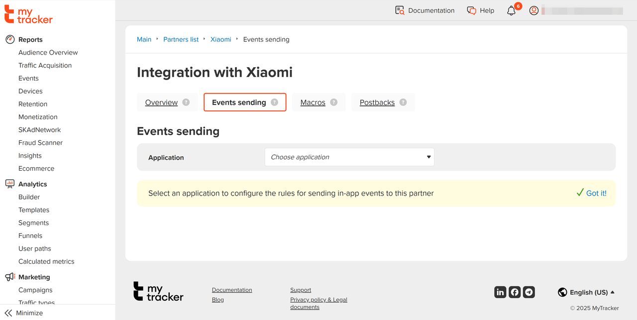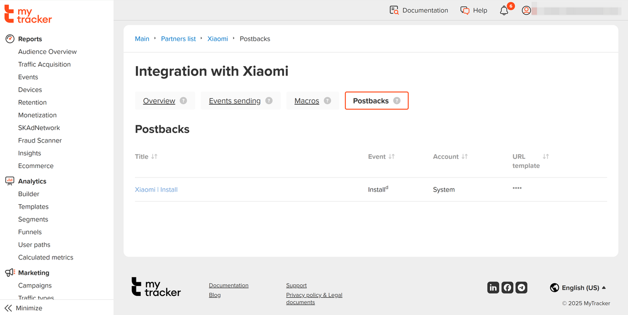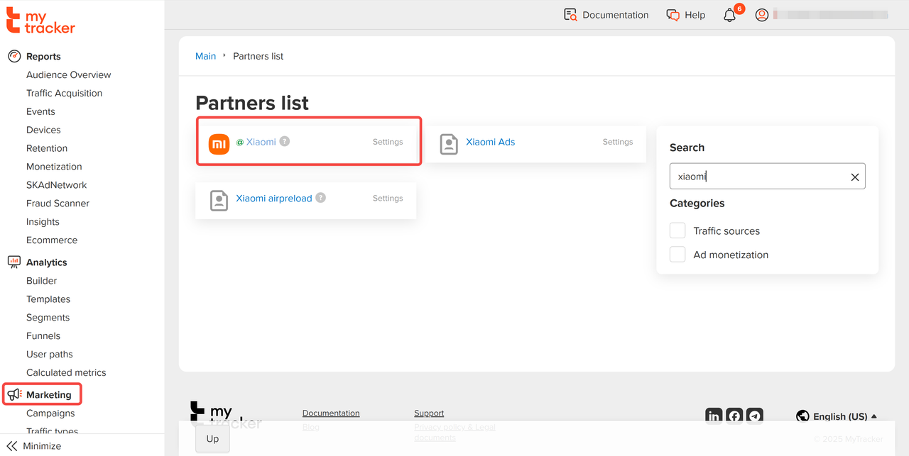 Log in to the MyTracker platform. Click "Marketing" -- "Partners", search for "Xiaomi" in the right sidebar and enter the page.