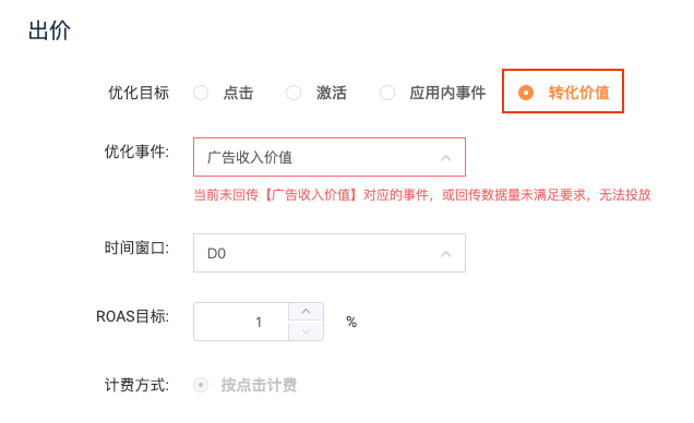 - 出价模块:优化目标勾选转化价值,目前优化事件支持广告收入价值,时间窗口支持D0,ROAS目标填写预期的D0 ROAS