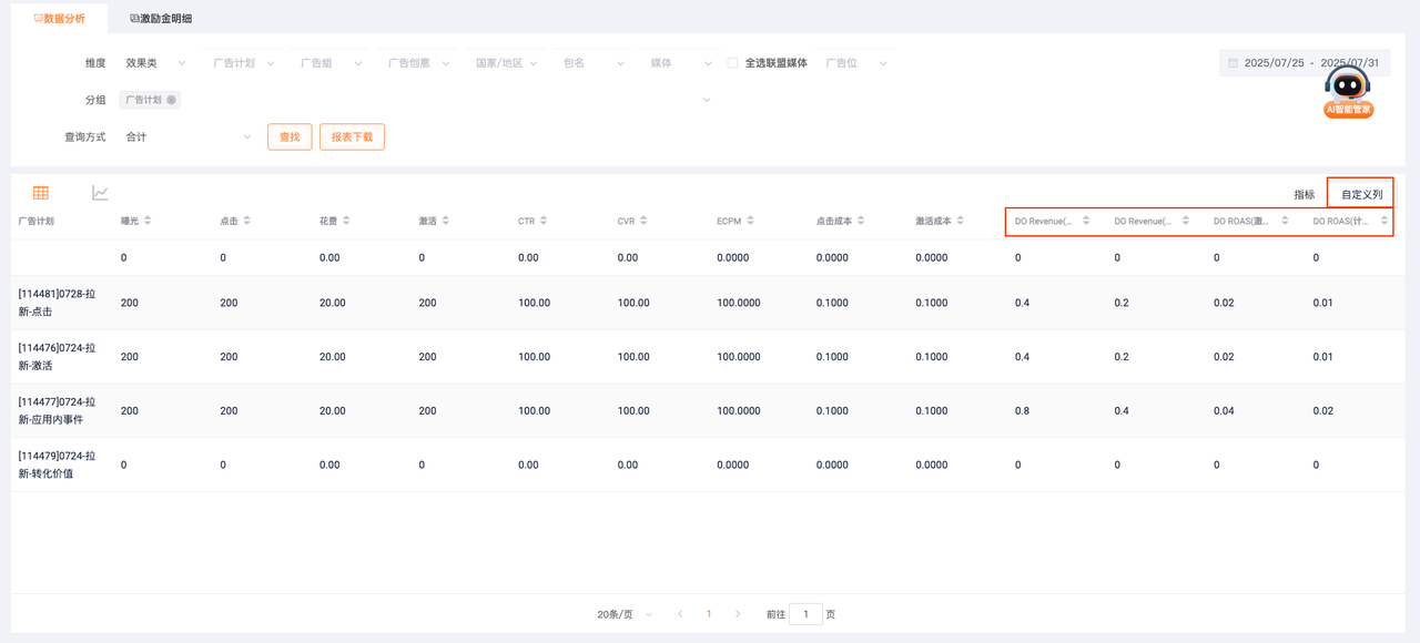效果观测:由于单天数据波动大,度过学习期后,建议拉长2-3天时间再关注广告的投放效果。可观测的指标:D0 Revenue(激活时间)/D0 Revenue(计费时间)/D0 ROAS(激活时间)/D0 ROAS(计费时间),在自定义列中筛选