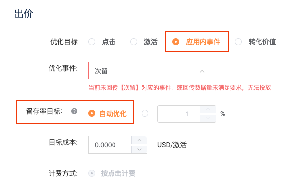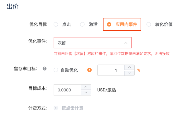 - 出价模块:优化目标勾选应用内事件,优化事件选择次留,留存率目标可选择自动优化或填写预期的留存率,目标成本填写预期的激活成本