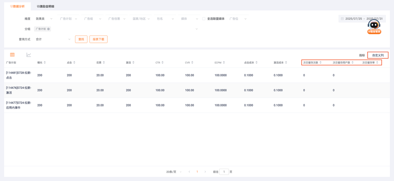 - 效果观测:由于单天数据波动大,度过学习期后,建议拉长2-3天时间再关注广告的投放效果。可观测的指标:激活成本/次日留存次数/次日留存用户数/次日留存率,在自定义列中筛选