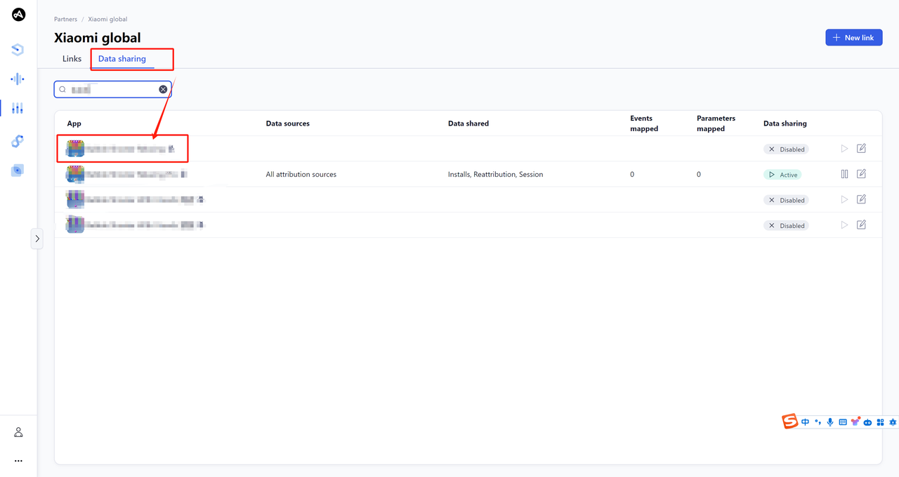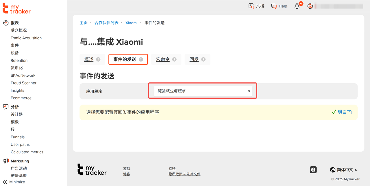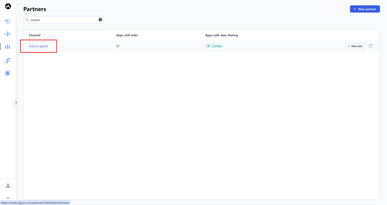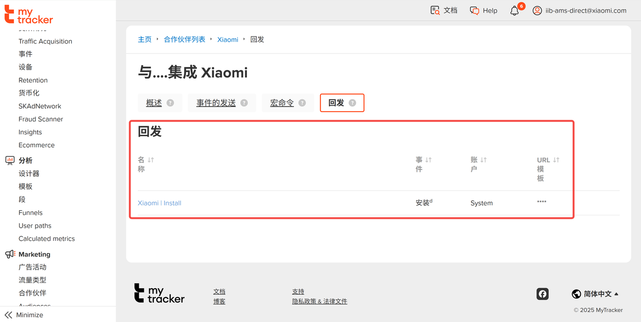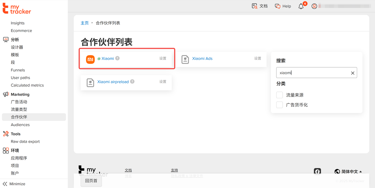 登录 MyTracker 平台。点击 Marketing--合作伙伴,在右侧边栏搜索小米后进入页面。