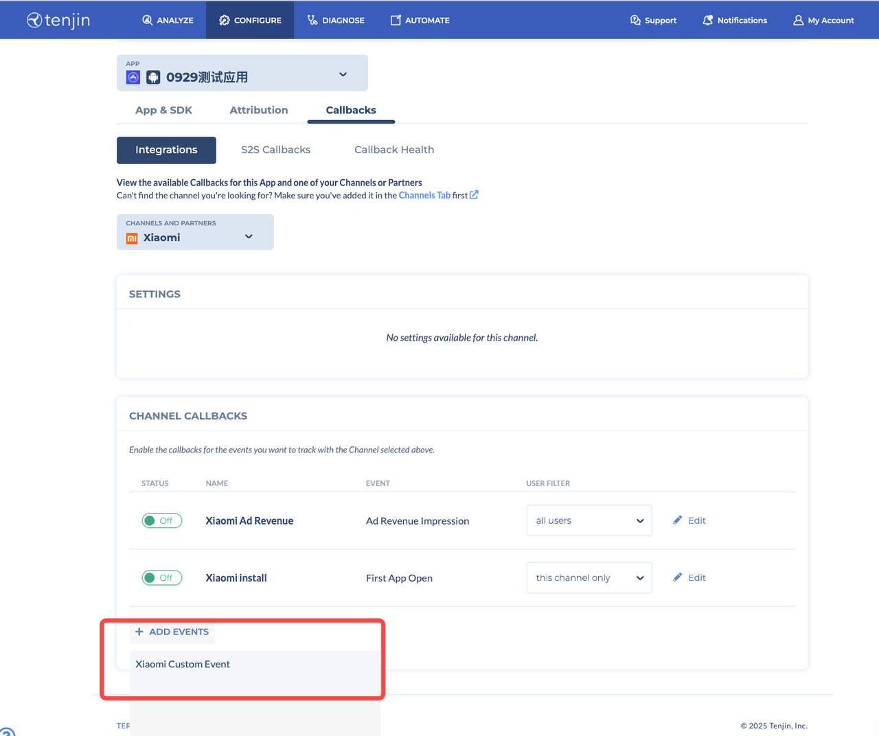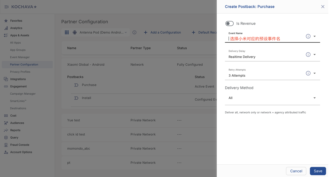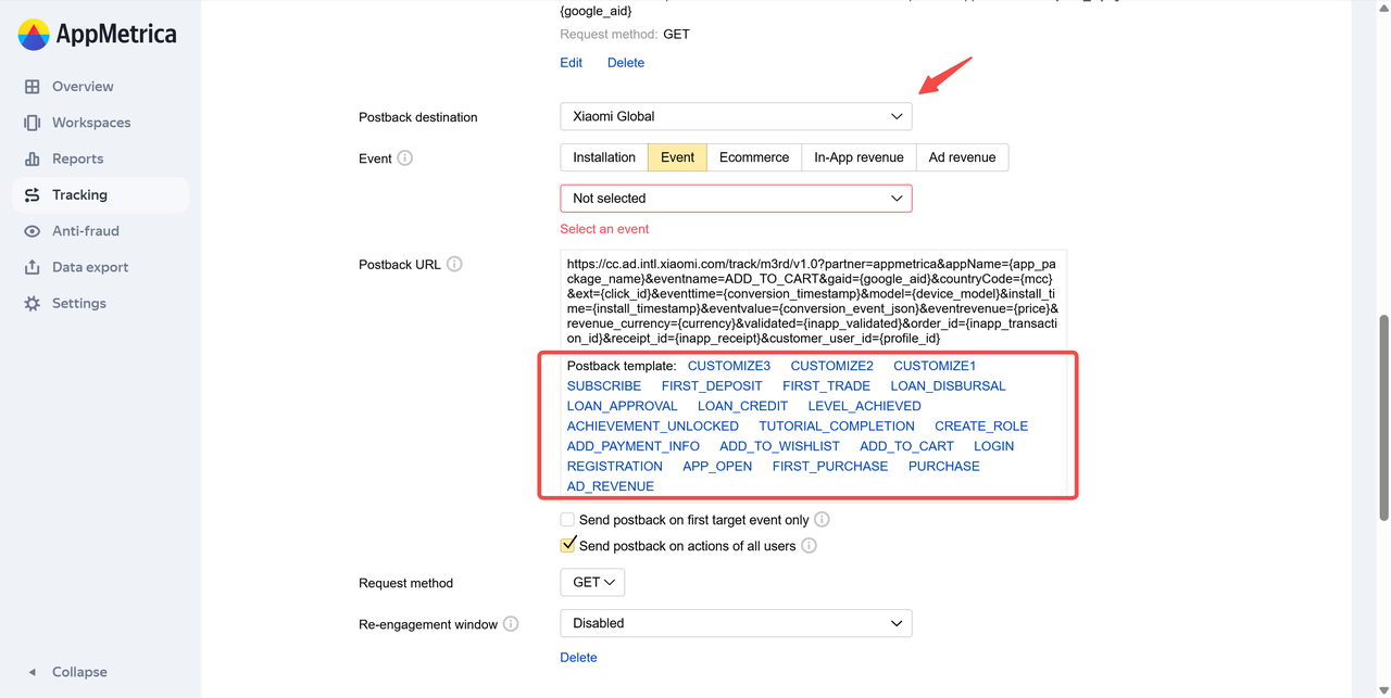 - "Postback destination"需要选择"Xiaomi Global"后选择"EVENT"