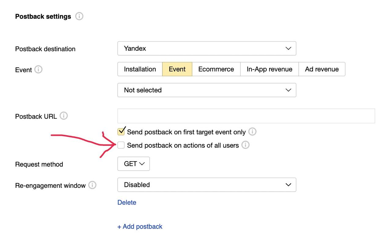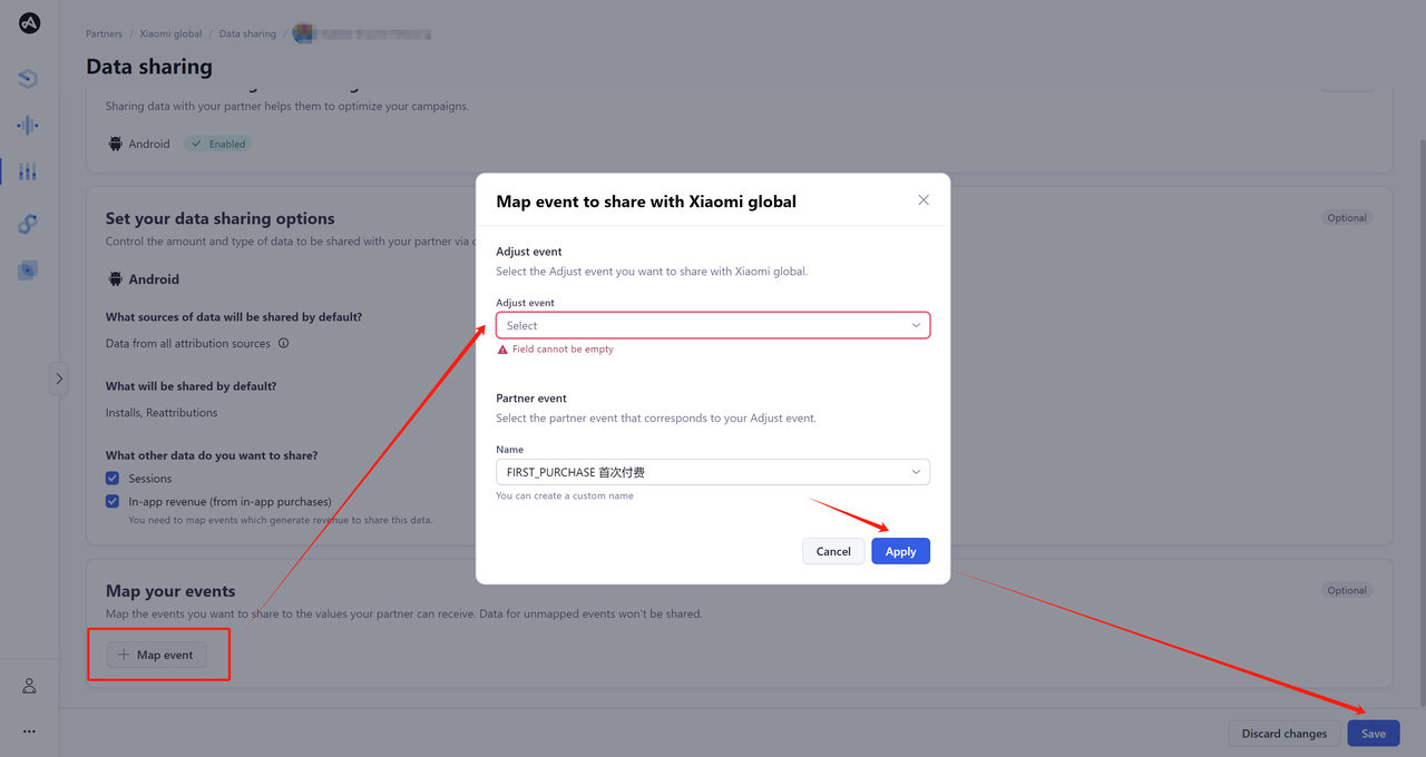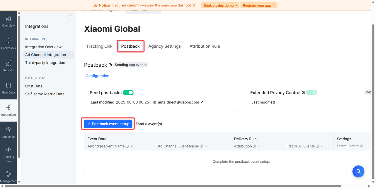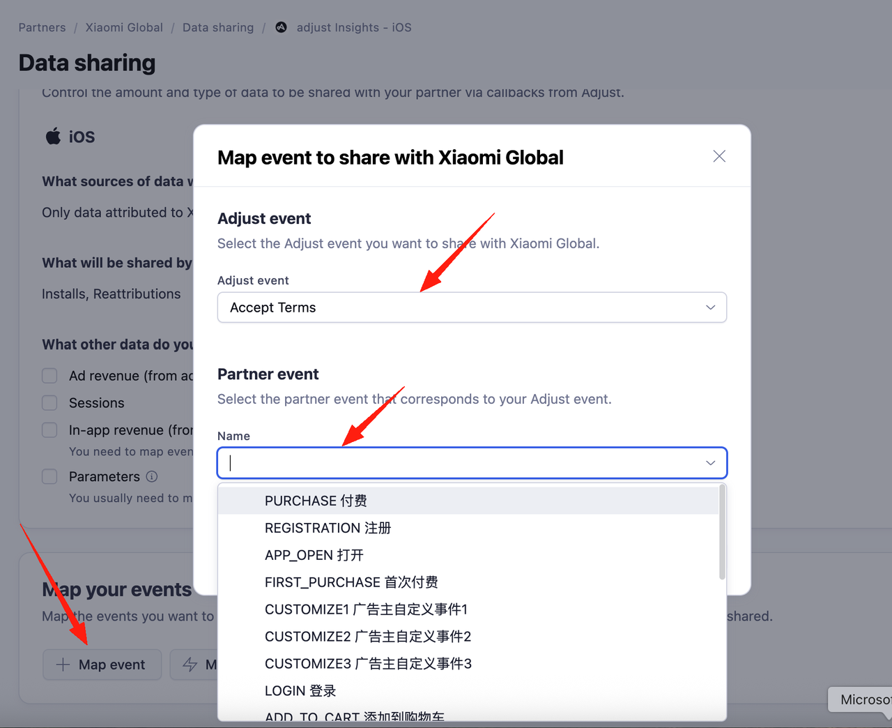 - "Postback destination"需要选择"Xiaomi Global"后选择"EVENT"