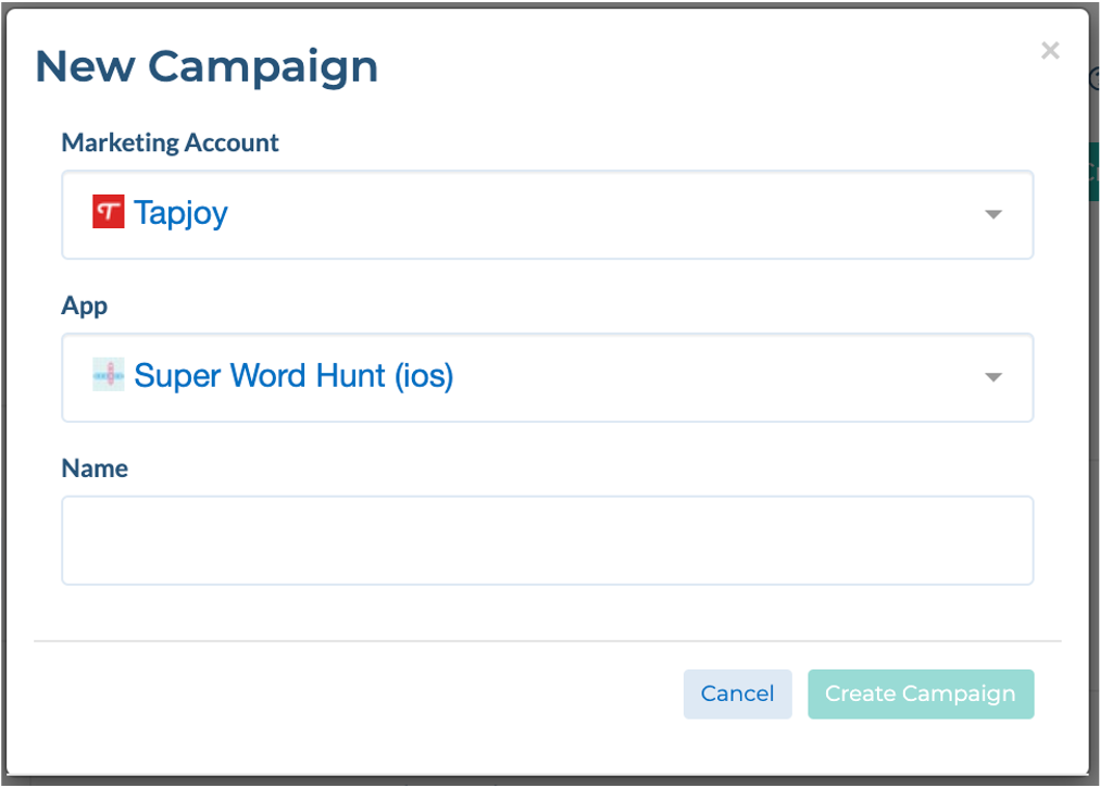 - 选择您需要投放的渠道及推广的应用。在这之前,请确保您已经正确添加 App 应用 and Ad network 投放渠道 ,并点击 "Create Campaign"。
