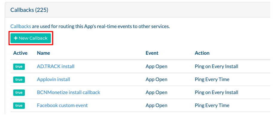 - 首先,在 CONFIGURE -> Apps 选择您需要配置的应用,点击 + New Callback.