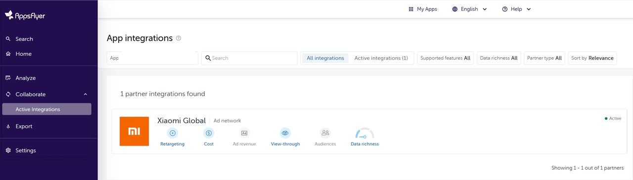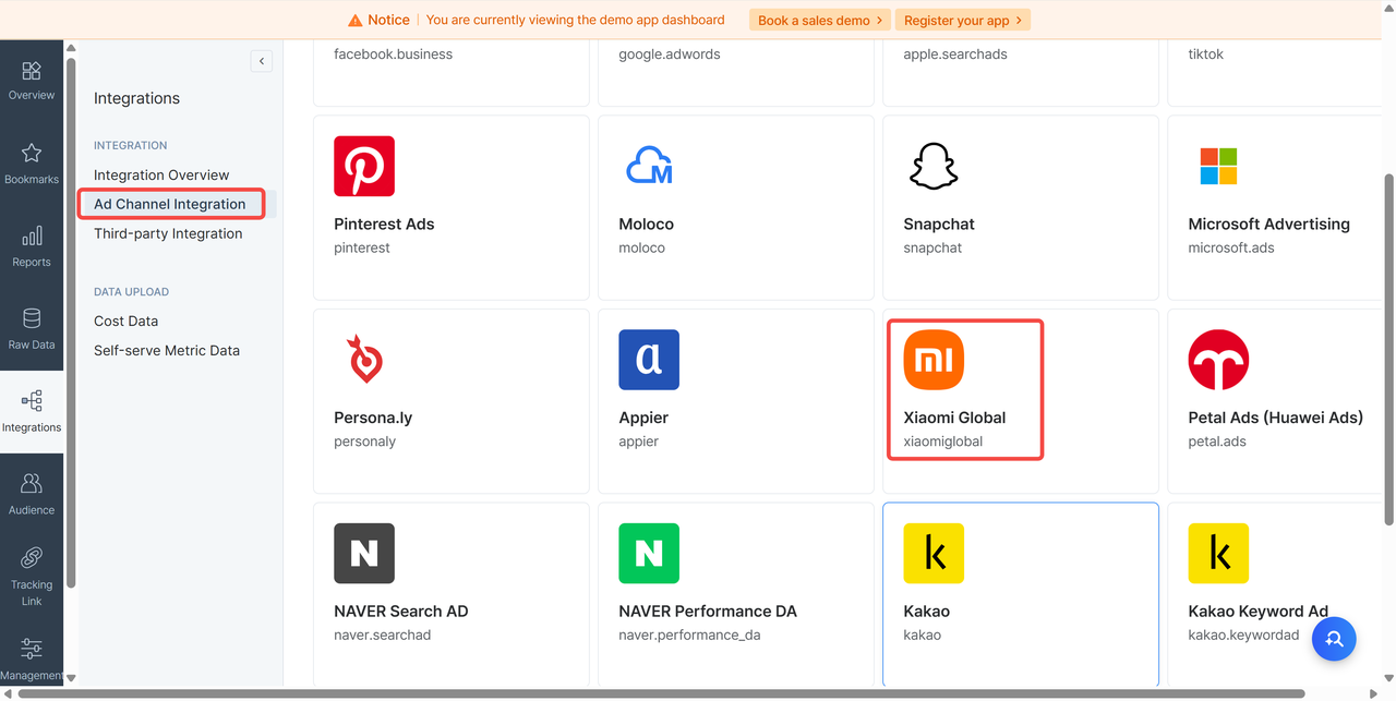 在侧边栏中选择"Integrations"之后,选择"Ad Channel Integration"后搜索并进入 Xiaomi Global.