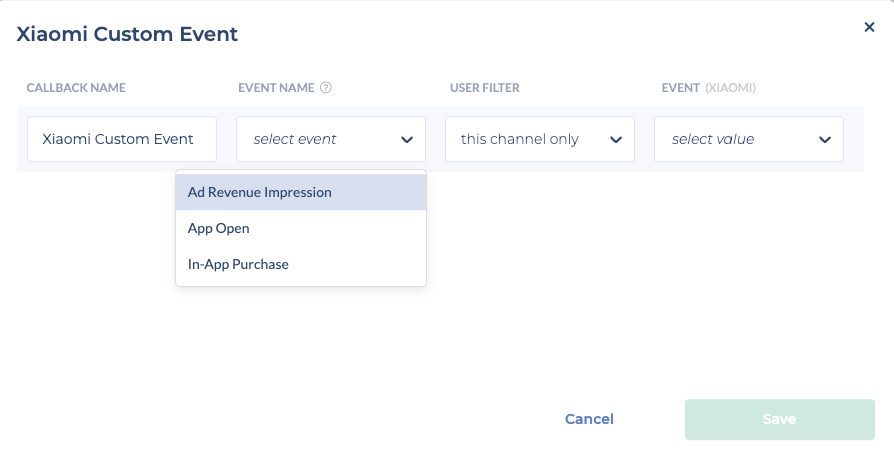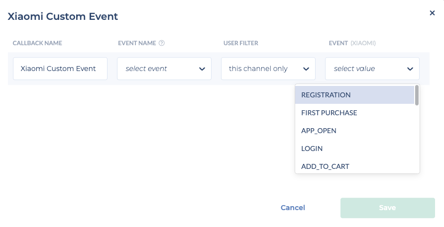 - 指定 Xiaomi 使用的事件名称,目前总共支持 22 个应用内事件,其中包括 3 个自定义事件,您可直接在下拉框中勾选需要映射给小米渠道的事件。您可以从列表中选择合作伙伴使用的事件名称,也可以选择“自定义”并输入任何其他事件名称。