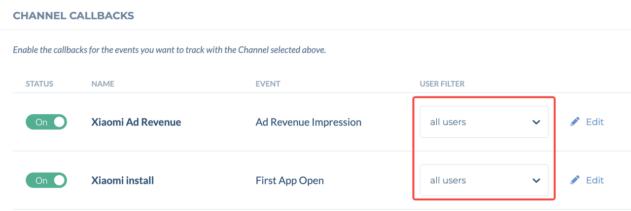 USER FILTER 处选择“all users"可将所有回传数据发送到 Xiaomi,包括已归因数据、未归因数据和自然数据,以便进行 Campaign 优化。