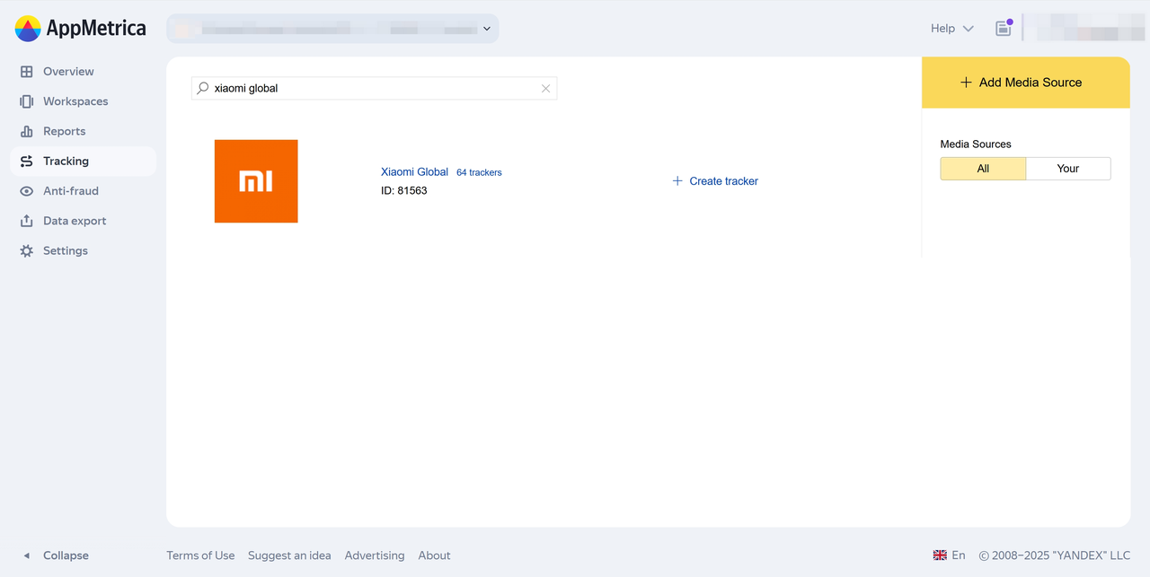 在"Tracking"里选择中选择"Media sources"后搜索"Xiaomi Global"。