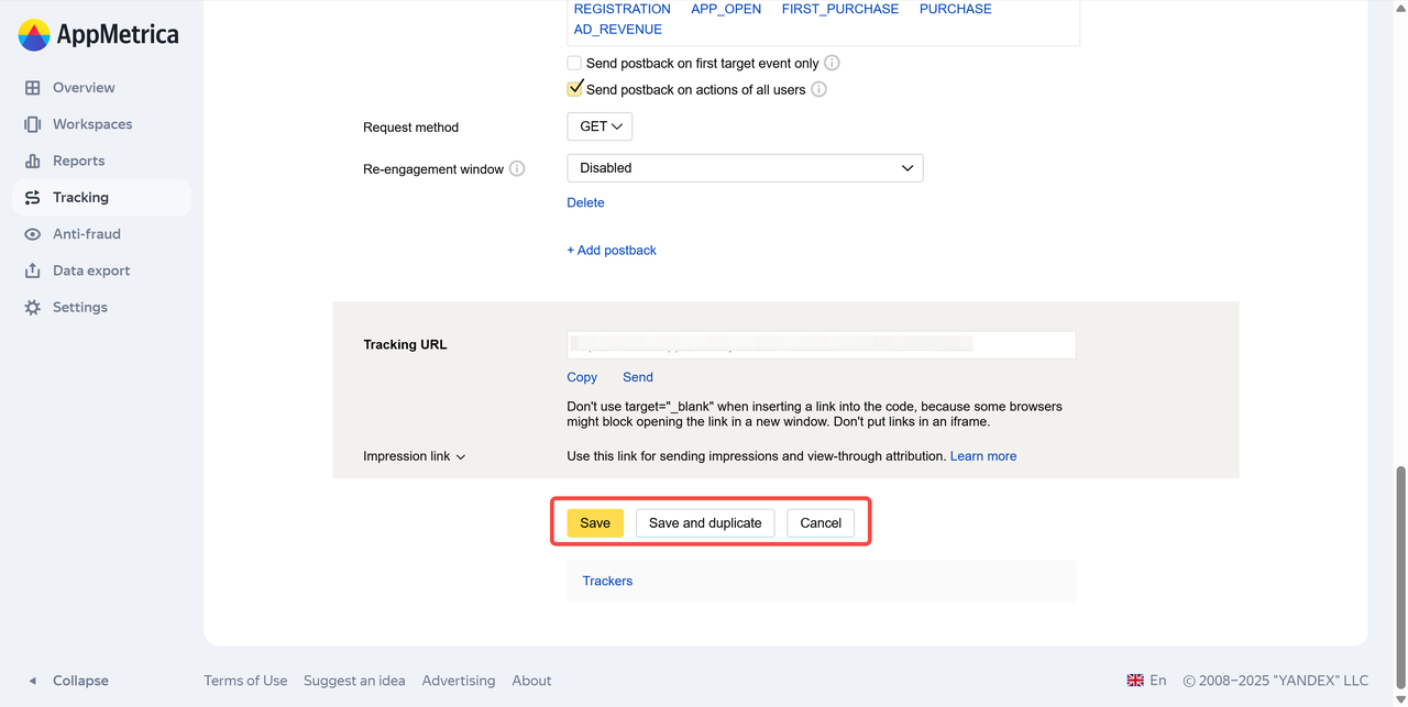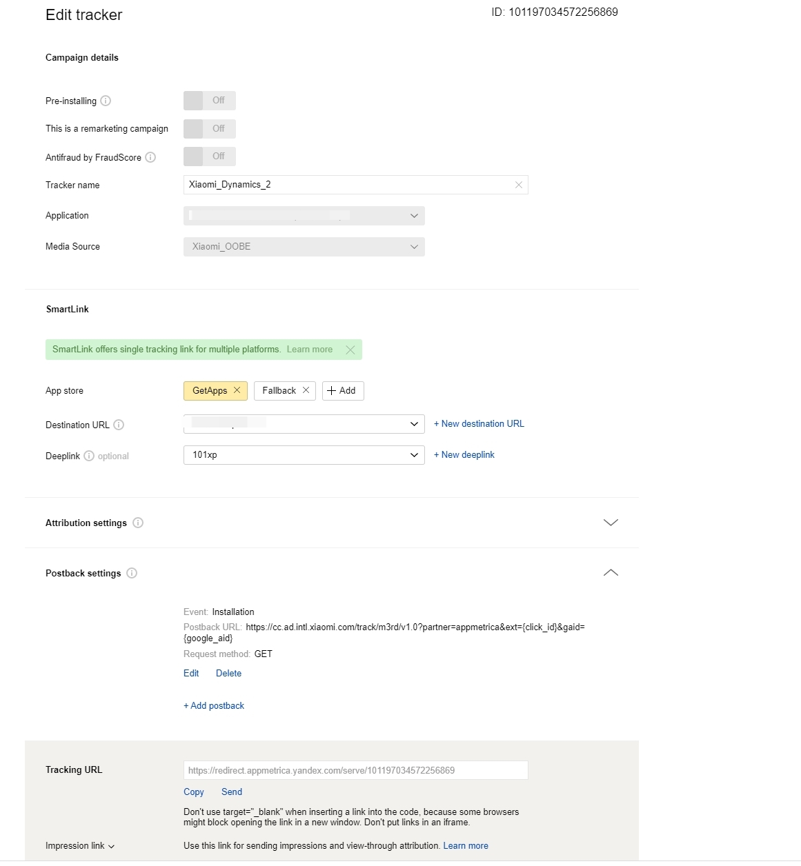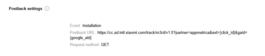 在“回传设置”下的“回传 URL”中填写:https://cc.ad.intl.xiaomi.com/track/m3rd/v1.0?partner=appmetrica&ext={click_id}&gaid={google_aid},系统将生成追踪url。