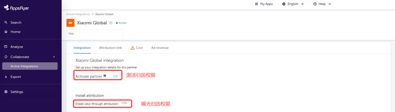 - 广告主在“integrated partner"中找到广告平台,并开启"Active Partner"开关,开关显示”on"后右下角点击保存。请确保 Install view-through attribution 切换键已设置为开启。
