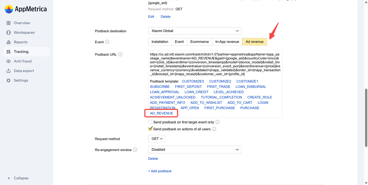 对于游戏客户,我们建议你回传 IAA 广告变现事件,在 Event 处选择 Ad revenue,生成对应的 postback url 回传给 Xiaomi Global。