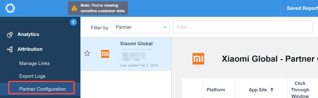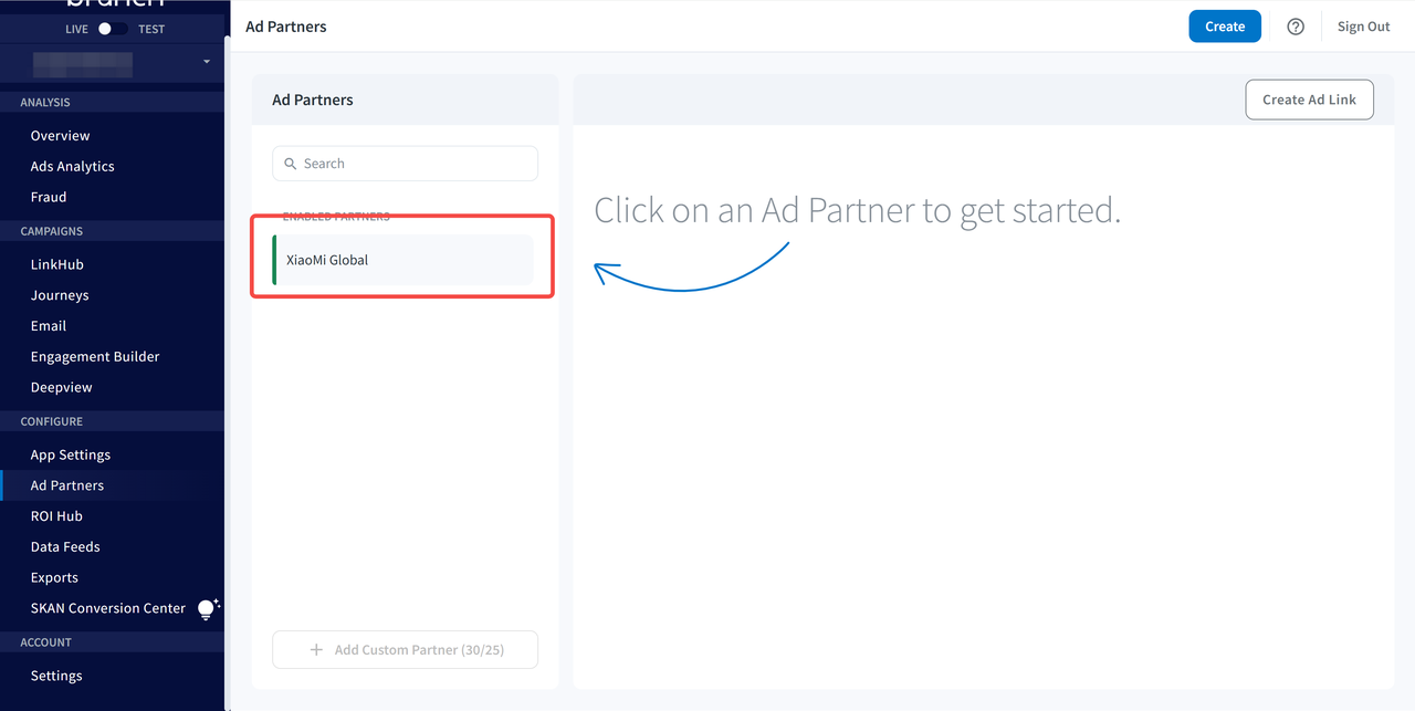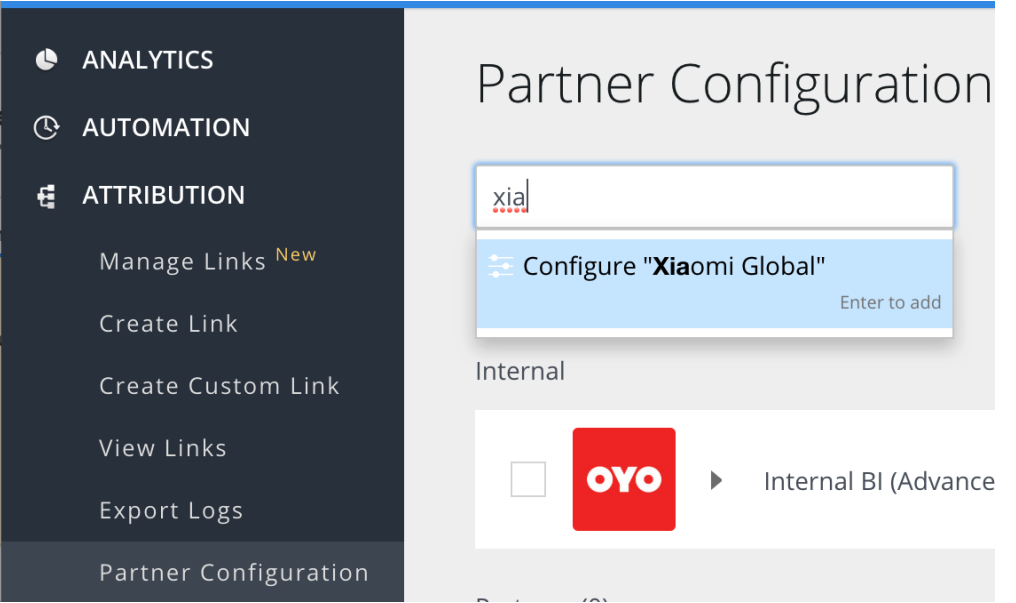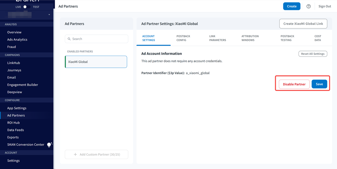 登陆 Singular 平台,点击 Attribution > Partner Configuration > Add a Partner > 选择 Xiaomi Global