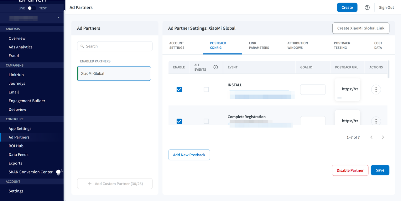 将 XiaoMi Global 启用为广告合作伙伴后,点击回传配置选项卡。在此选项卡中,您可以找到所有单独的回传,还可以添加您想要转发给 XiaoMi Global 的其他回传事件。如果希望配置更多回传,向下滚动屏幕并点击添加新回传。确保勾选您要启用事件的所有事件框,然后点击右下角的保存按钮确认配置。