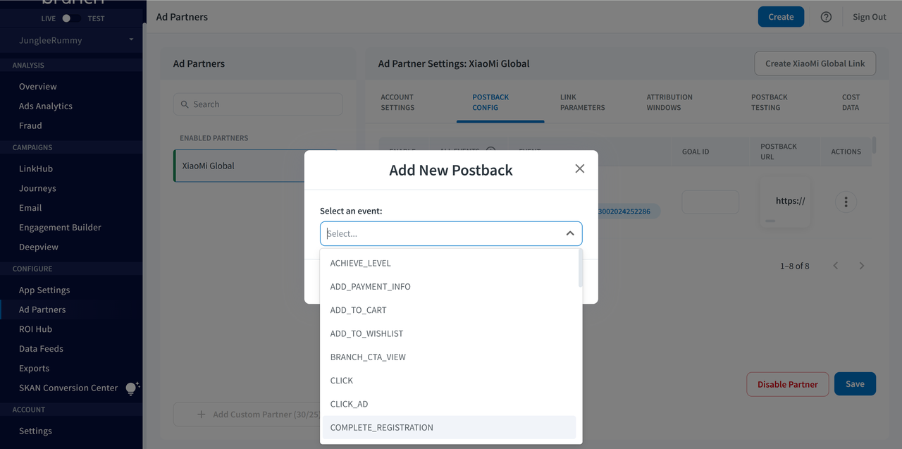 打开 Send postbacks 开关,并在"Postback"中选择"Postback event setup"以配置应用内事件回传,目前小米总共支持 22 个应用内事件,其中包括 3 个自定义事件,您可直接在下拉框中勾选需要映射给小米渠道的事件。