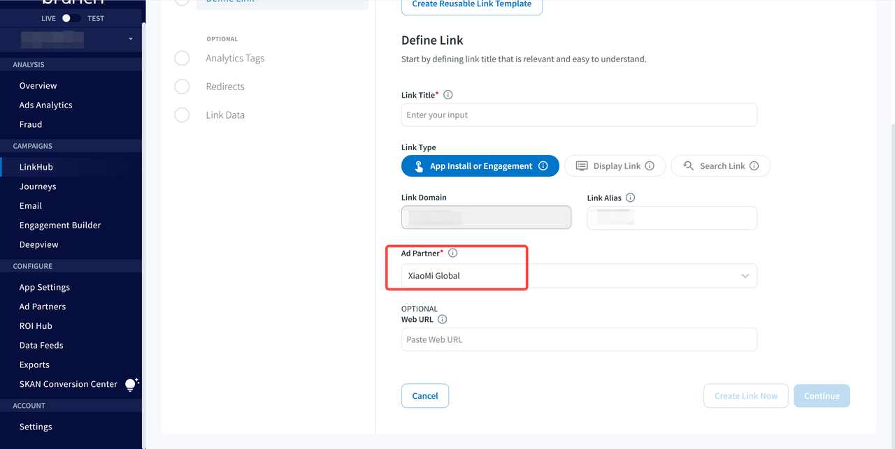 在 Partner Management 窗口点击 Create XiaoMi Global Link。您会看到以下广告链接格式的选项: