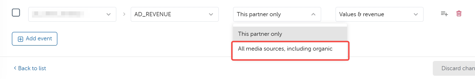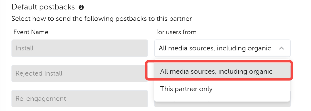 - 对于 Default postbacks,从每个事件的下拉菜单中选择 All media sources, including organic。此选项支持您与 Xiaomi Global 共享所有回传数据,包括 Xiaomi Global 已归因数据、未归因数据和自然数据。