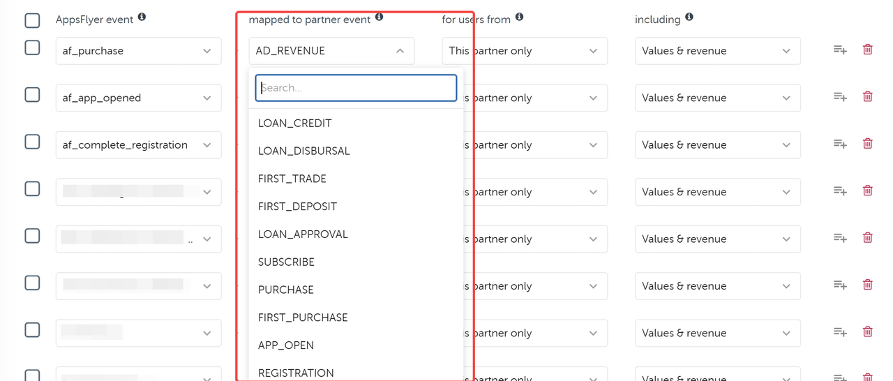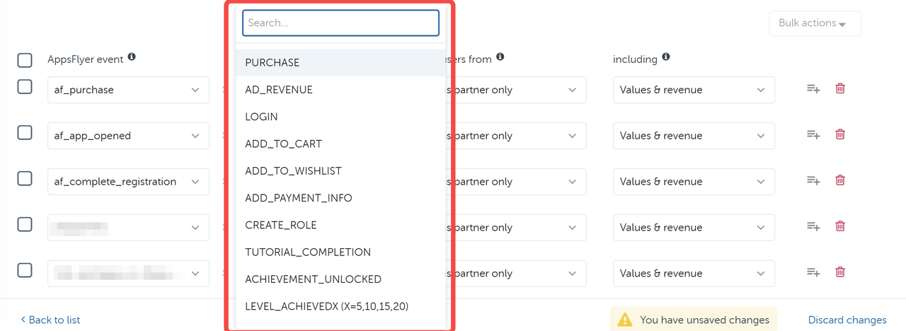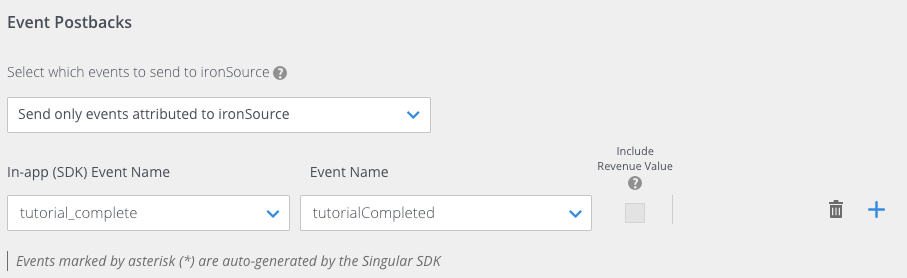 - 选择是否要向网络发送事件回传。通过指定 "应用内 (SDK) 事件名称"、"事件名称 "以及是否要包含其收入值(如果适用)来添加事件。