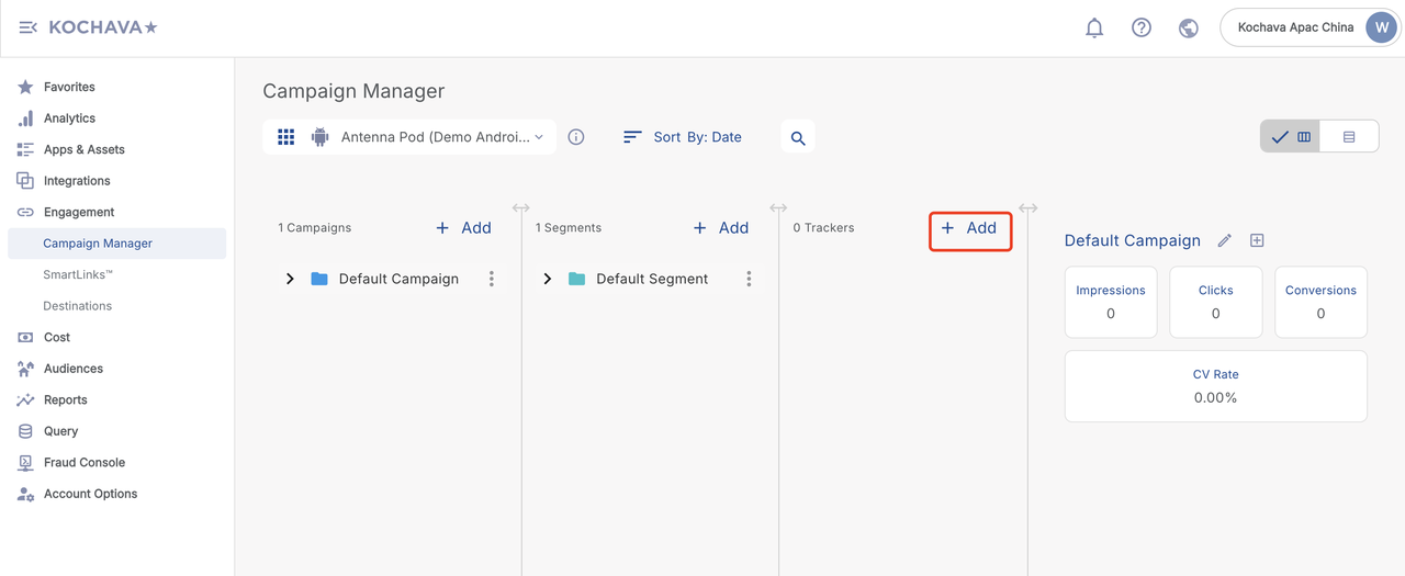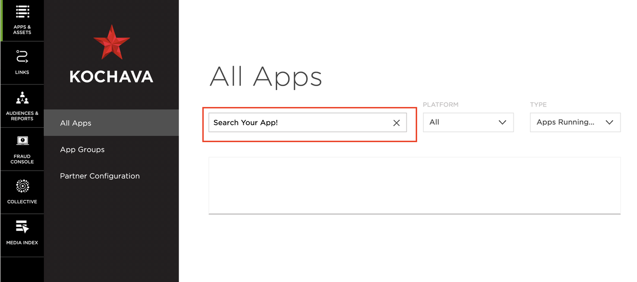 登录 Kochava 平台。在屏幕左侧的菜单上,点击 APPS & ASSETS -- ALL APPS。在搜索栏上搜索您的 App 名称,找到您的 App。