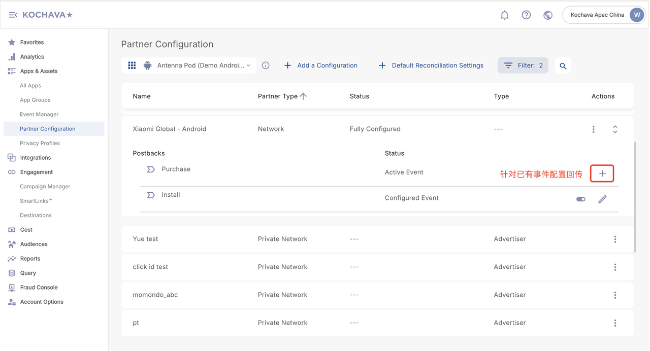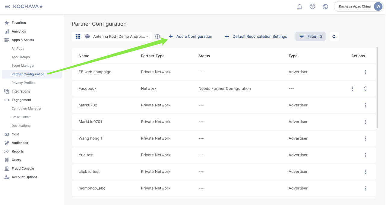 进入 Kochava 的页面后,在左侧边栏找到合作伙伴配置,点击新增配置。
