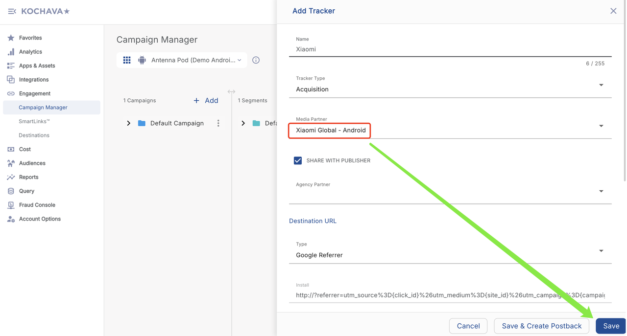 在左侧的广告合作伙伴部分中搜索 XiaoMi Global,然后点击右下角的保存并启用按钮。