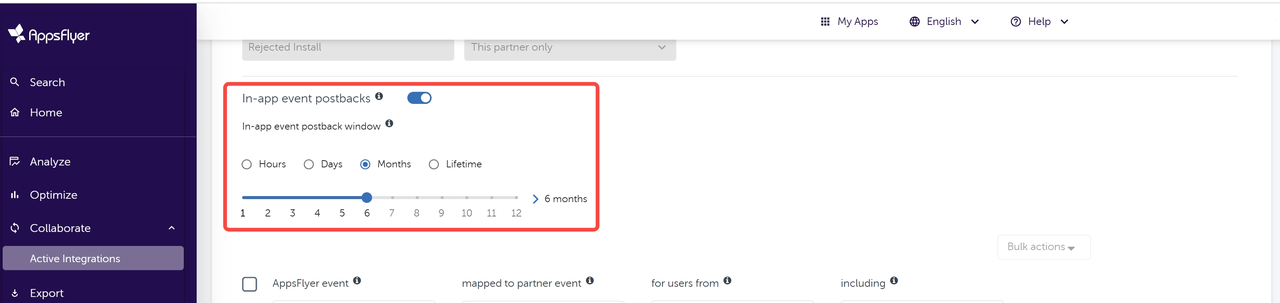 请确保将 In-app event postbacks 切换键设置为开启。您必须为 In-app event window 选择一个选项,以指定在安装、再归因或再互动后多久将应用内事件回传发送到 Xiaomi Global。对于 In-app event window,我们建议选择 Lifetime,确保应用内事件回传始终发送到 Xiaomi Global,以优化您的 Campaign。