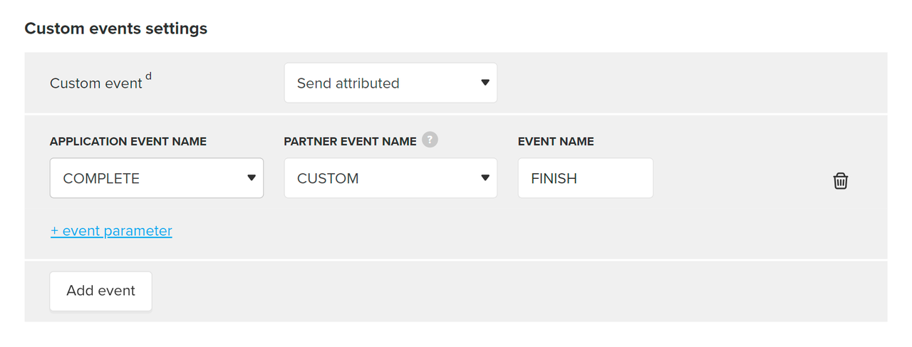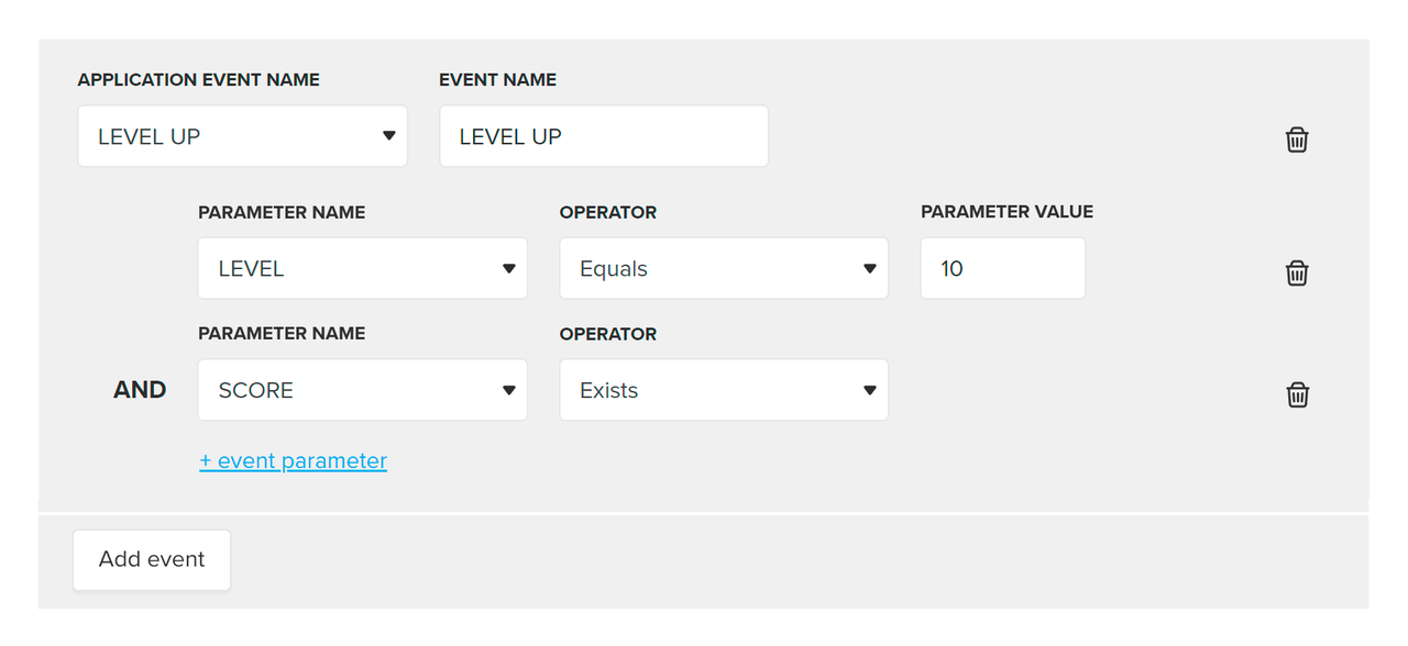添加"+event parameter"以明确发送回发的条件。例如,只有当“level”参数为“10”时,您才能发送“LEVEL_ACHIEVED”回发。