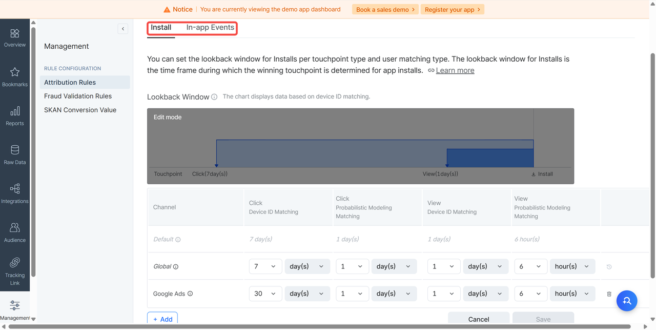 点击"Attribution Rule",可对您当前的回传设置激活的归因窗口期和应用内事件的归因窗口期。
