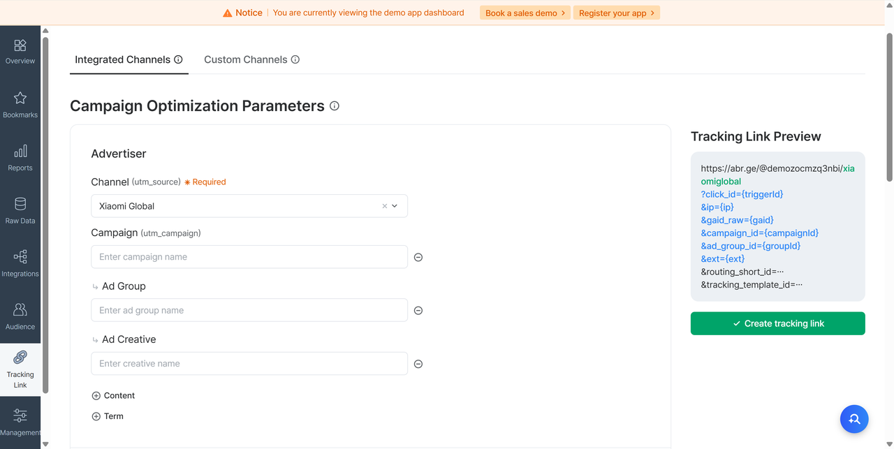 当前 Airbrige 已有配置好的基础追踪链接,您可根据自己的广告计划添加特定的字段,并将该追踪链接复制到 Mi Ads 的创意编辑页中的点击地址处。